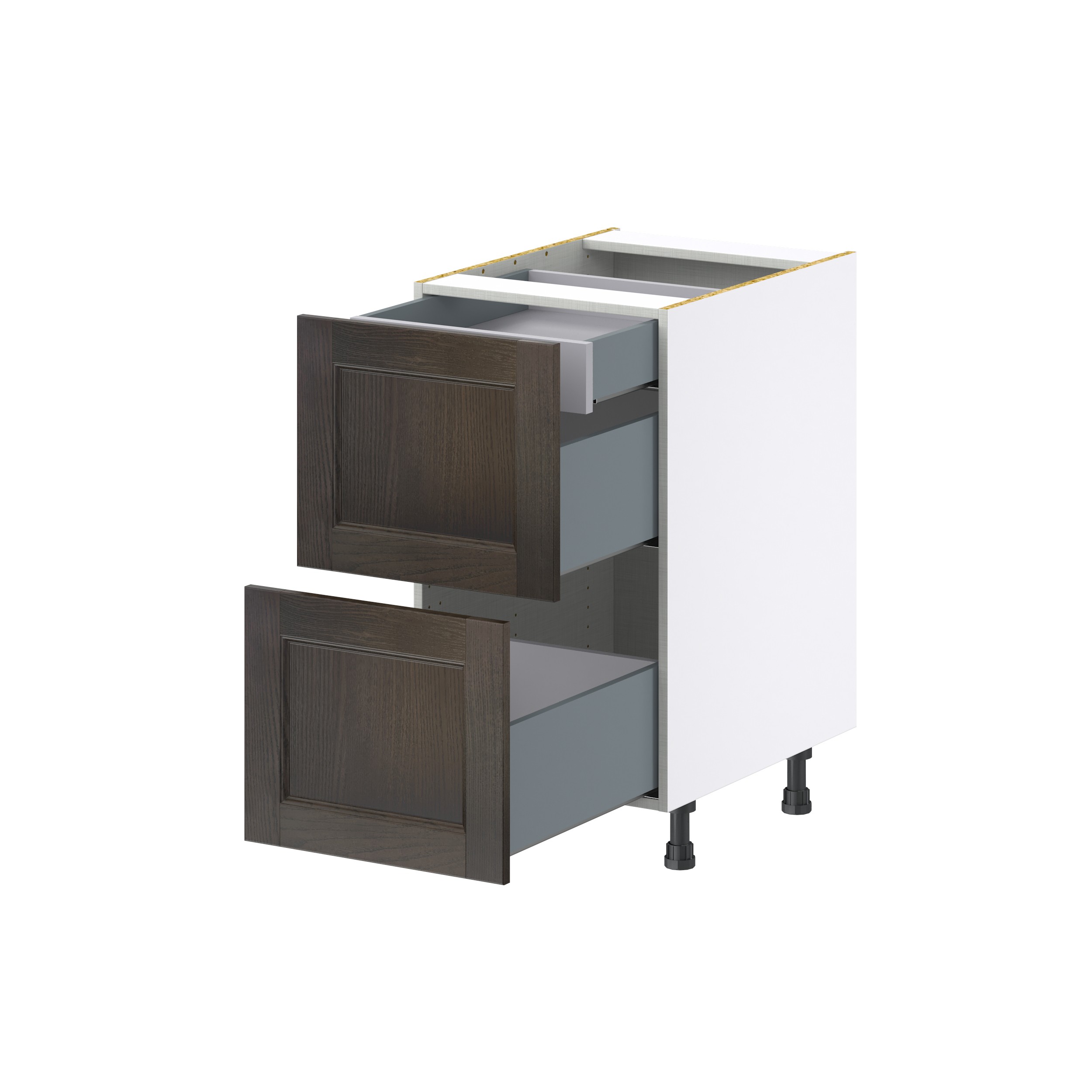 - Sleek metal drawer boxes with full extension undermount slides and soft close